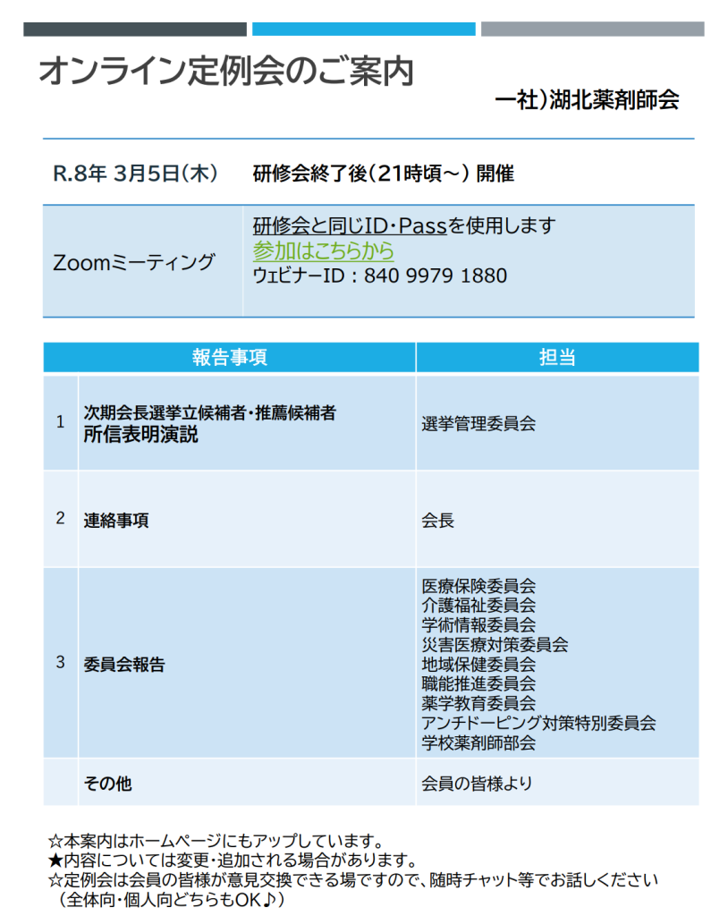 3/5オンライン定例会のご案内 以下の内容にて、オンライン定例会を行います。今回は冒頭に「次期会長選挙 所信表明演説会」を行いますので是非ともご参加下さい。ご参加の際には表示名を「お名前+所属先」として頂きますよう、よろしくお願いいたします。オンライン定例会の参加はこちらから 案内文はこちら