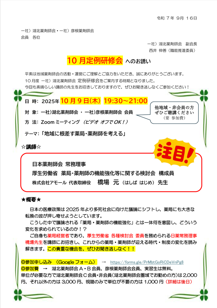 ※2024年5月19日付で「湖北薬剤師会主催の研修会参加の注意点」を改訂いたしました。必ずご確認下さい。